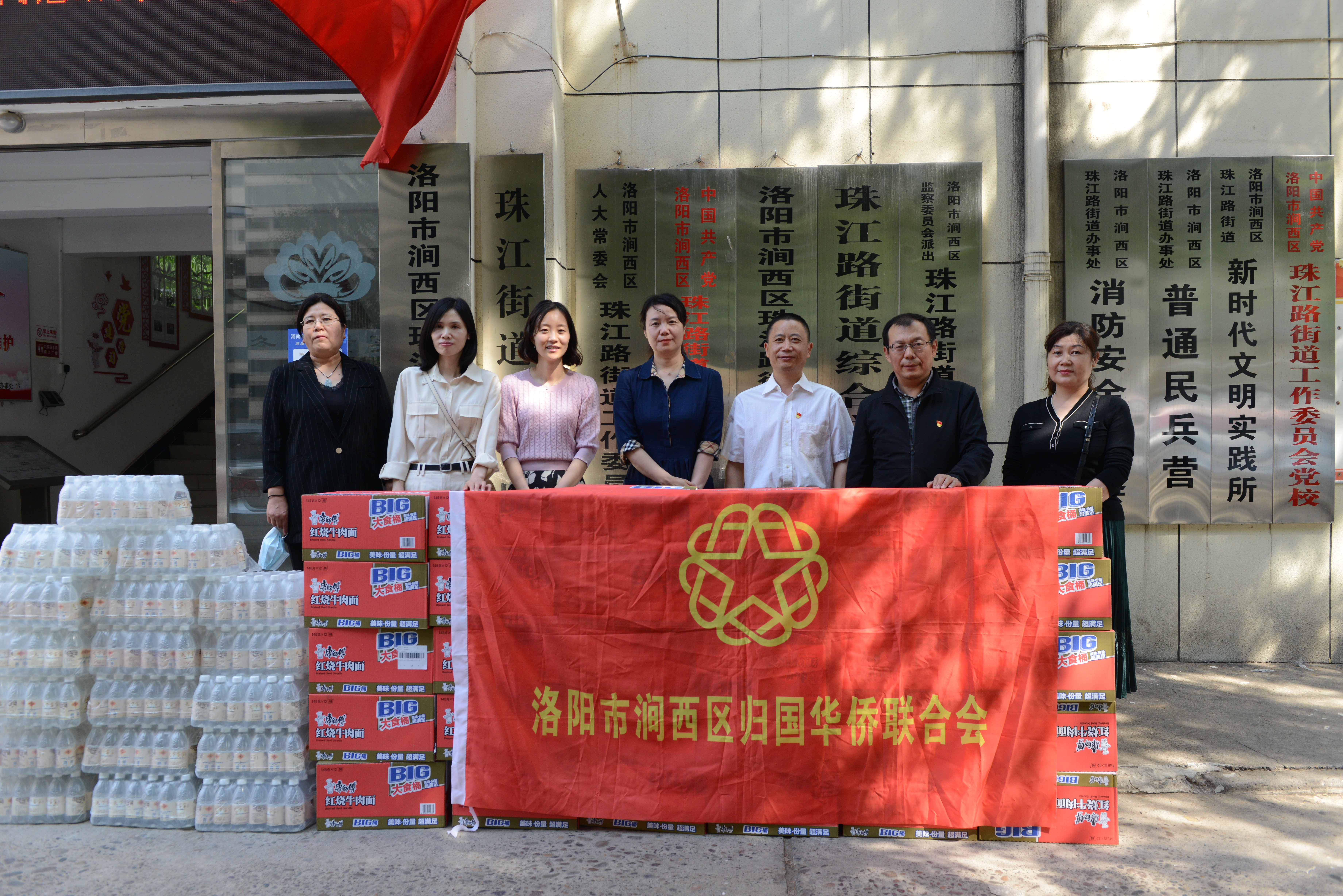 5月6日上午,洛阳市涧西区侨联组织辖区涉侨企业洛阳暖鑫热力有限公司子公司臻如物业公司向珠江路办事处捐赠抗疫物品。此次捐赠物品包括康师傅碗面30箱、矿泉水30件,价值人民币近4000元,将全部用于慰问社区全员核酸检测一线医护人员和社区工作者,为打赢新冠疫情防控阻击战贡献侨界力量。