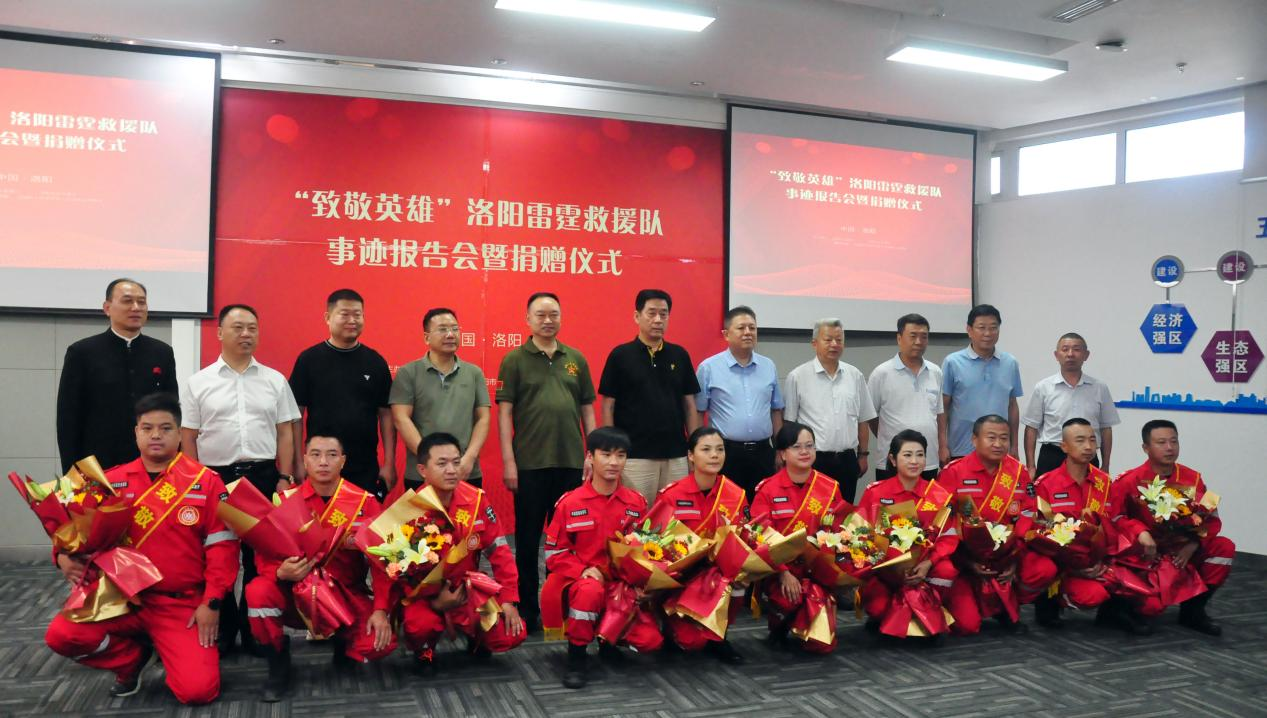 9月7日下午,“致敬英雄”洛阳雷霆救援队事迹报告会暨捐赠仪式在洛阳炎黄科技园举行?;疃?,洛阳市侨商联合会倡议并联合爱心商协会和企业为洛阳雷霆救援队捐赠4.2万元爱心善款及10万元爱牙消费基金。市人大原副主任、洛阳市见义勇为协会理事长白志刚,市侨联党组成员、副主席杨晓冬,市侨联四级调研员陈红超参加活动。