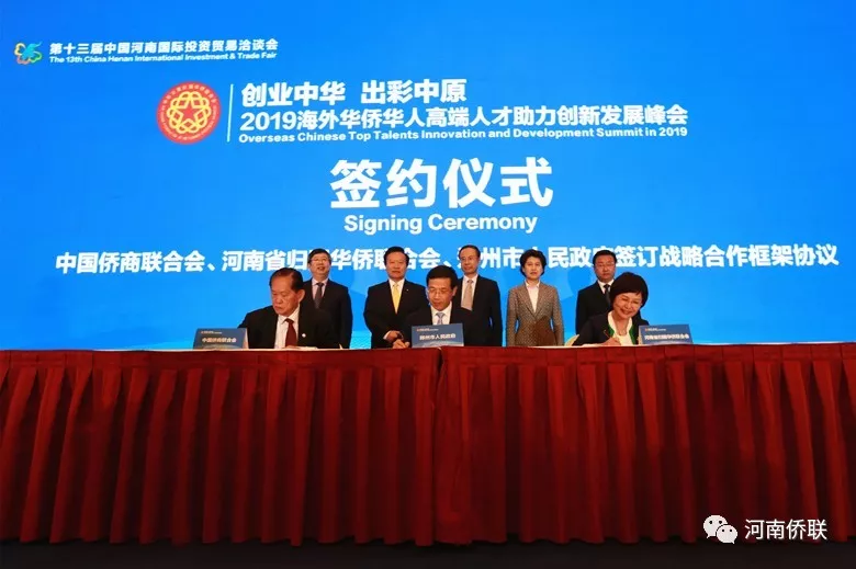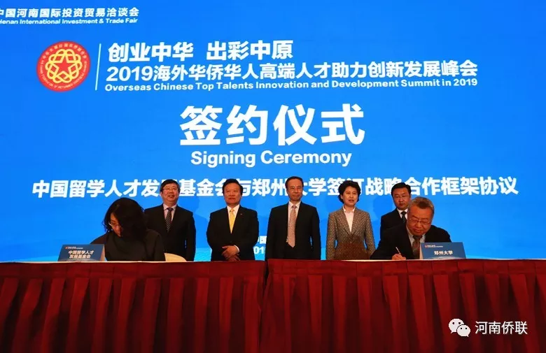 活动现场,中国侨商联合会、河南省归国华侨联合会、郑州市人民政府签订战略合作框架协议,中国留学人才发展基金会分别与郑州市人民政府、郑州大学签订战略合作框架协议,合作方将共同搭建高端人才发展平台,推动中原更加出彩。