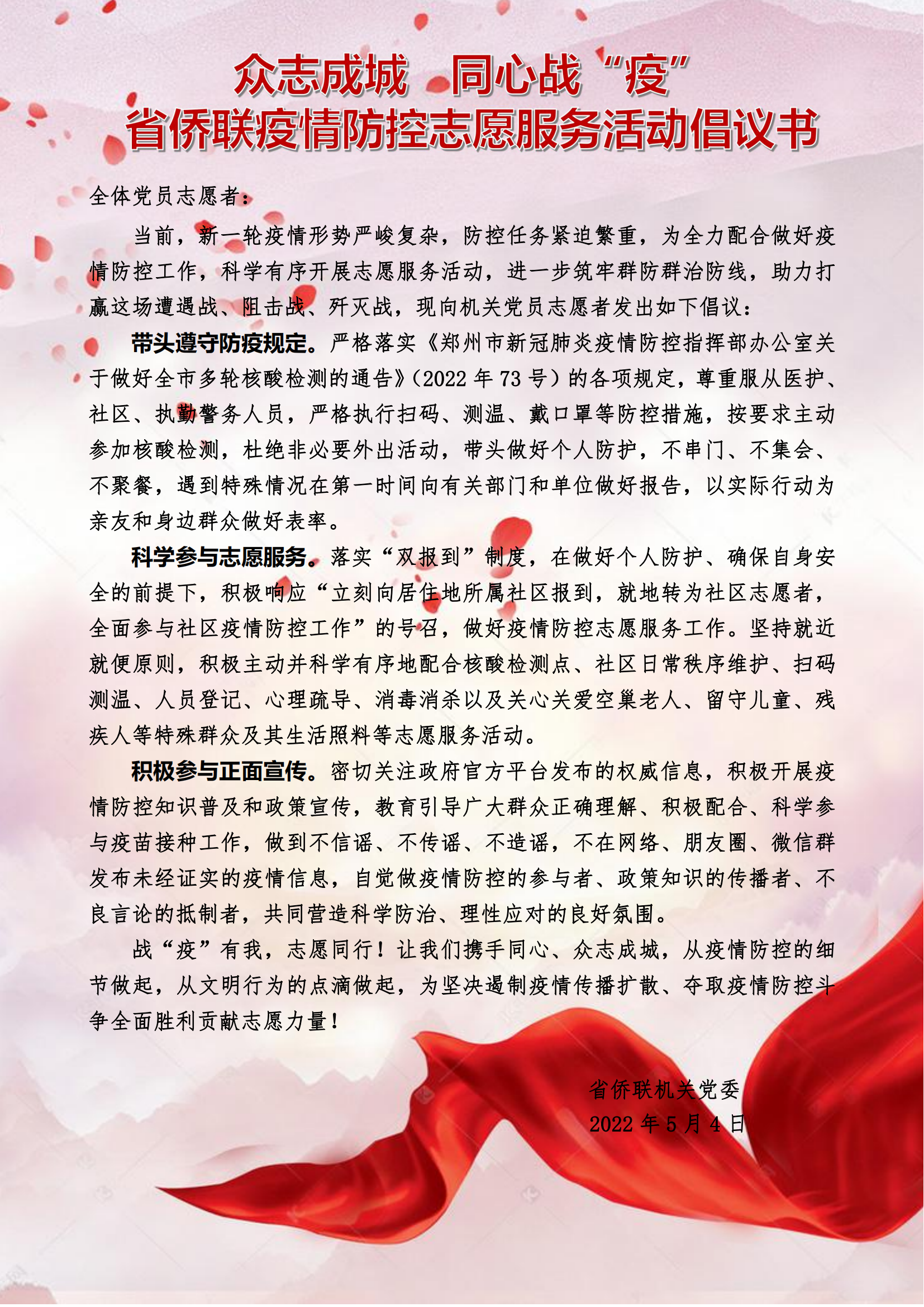 众志成城 同心战“疫” 省侨联疫情防控志愿服务活动倡议