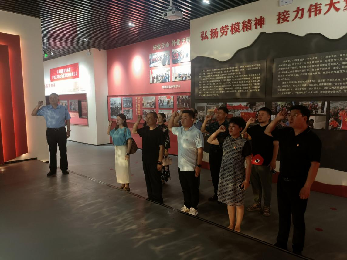 纪念馆中,一幅幅图片、一件件文物映入眼帘,随着解说员的深入讲解,大家仿佛回到了那个特别的年代。大家认真听讲解,看展览,不时驻足观看赵春娥用过的物品,感悟赵春娥说过的话语,深刻感受她伟大的奉献精神,大家无不为赵春娥艰苦奋斗、无私奉献的劳动模范精神所感动。在杨晓冬的带领下,大家整齐列队,高举右手,庄严宣誓、重温了入党誓词,表达了对老一辈劳动者的深切缅怀和崇高敬意。