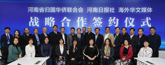 4月27日,河南省侨联、河南日报社与海外华文媒体战略合作签约仪式在郑州举行。中国侨联信息中心副主任张献锋,河南省侨联党组书记、主席杨海强,二级巡视员刘合生,河南日报社党委副书记、总编辑孙德中,党委委员、副总编辑张学文,省委宣传部对外宣传办公室主任刘好及来豫参加“追梦中华·读懂黄河”2023海外华文媒体河南采访行活动的海外华文媒体、涉侨中央媒体嘉宾出席仪式。